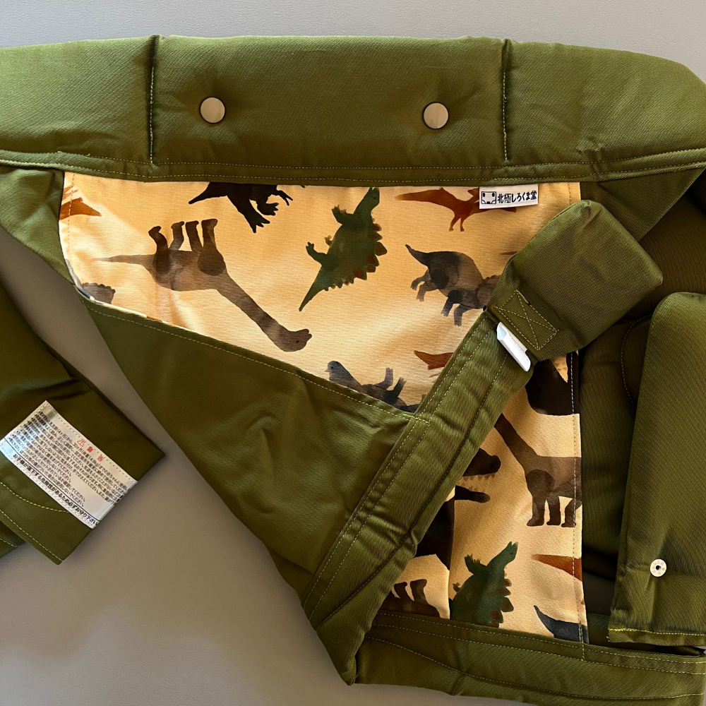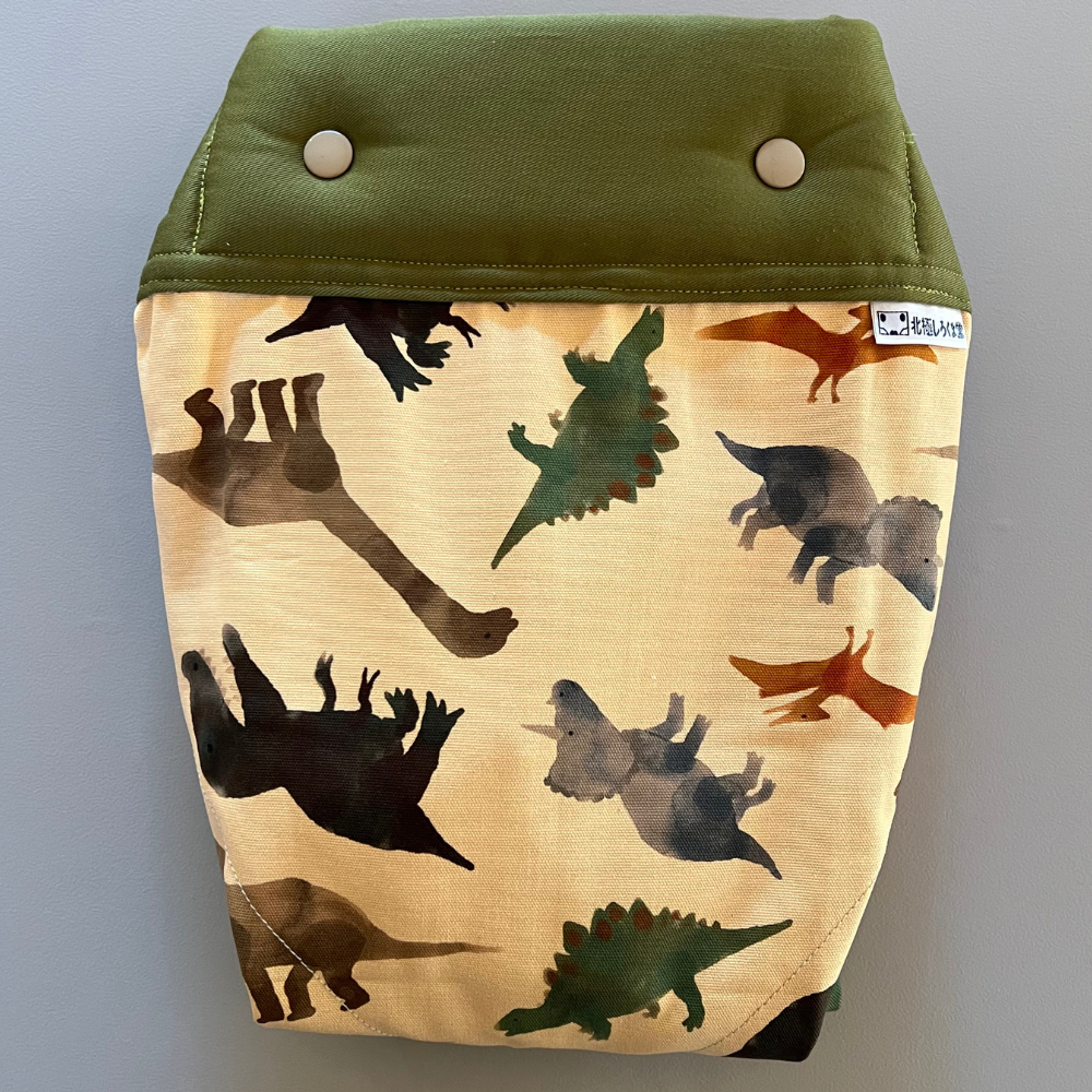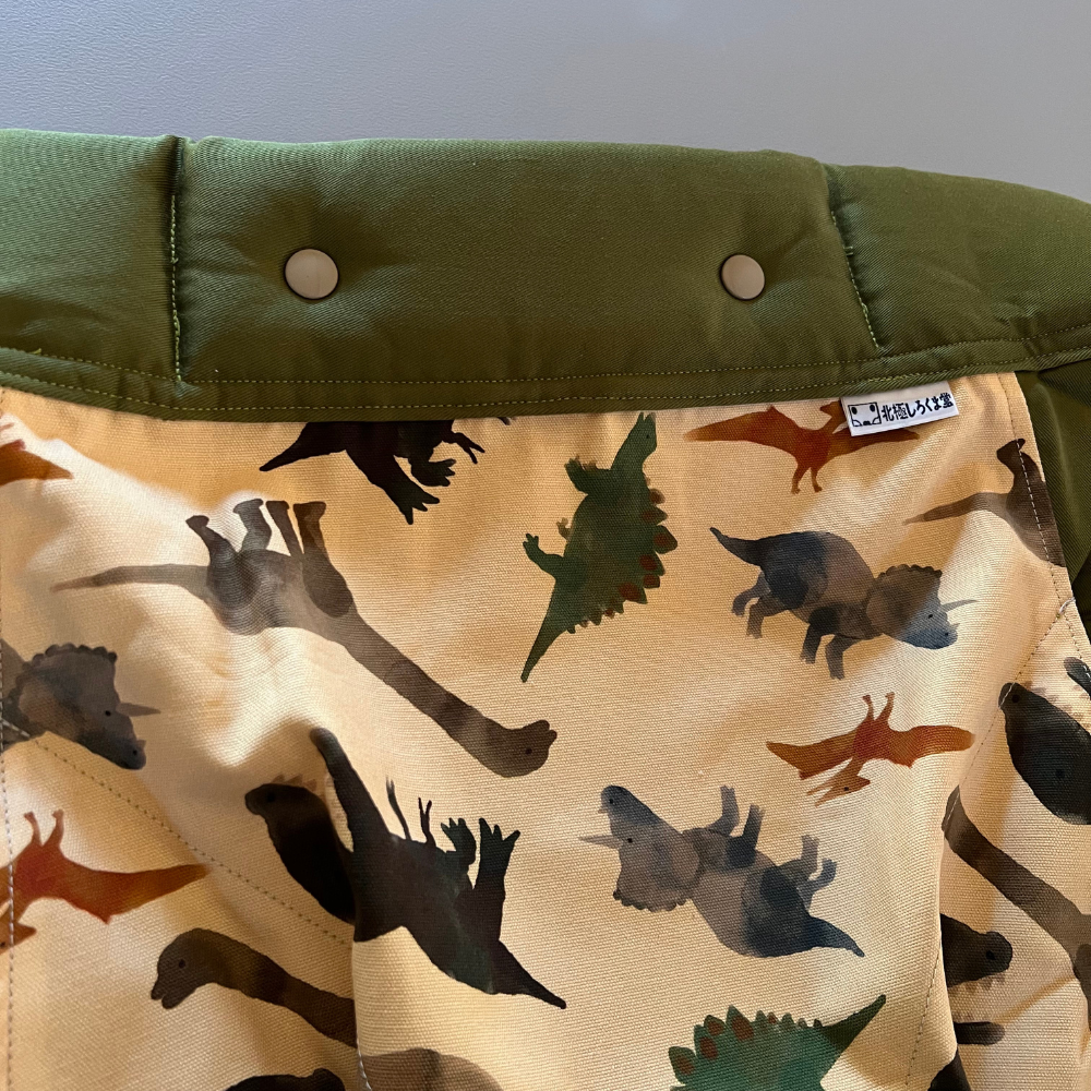 ちょっとかわいい雰囲気の恐竜が描かれている背あてに、モスグリーンを合わせました。