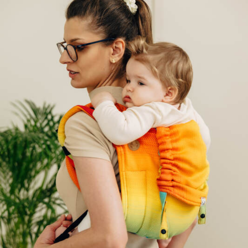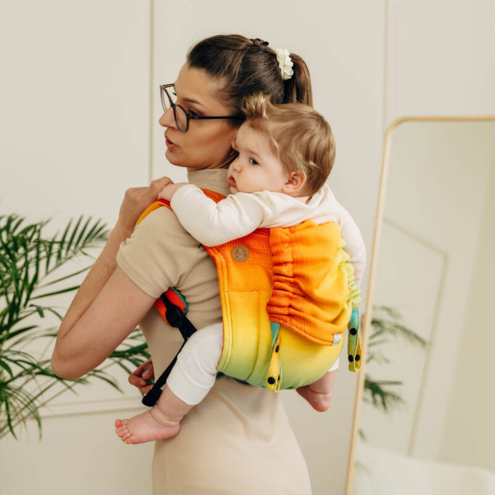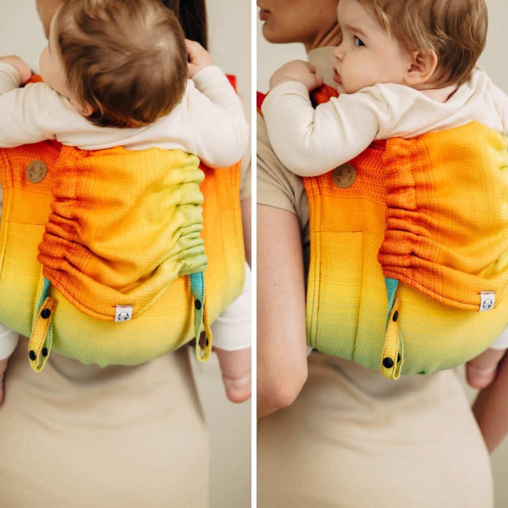 LennyLambバックル留め Onbuhimo(おんぶひも)です。高い位置でおんぶすることができ、ぴったり密着して安全におぶえます。色は思いきり明るいレインボーカラーです。日本で初めて輸入した色なので、国内初の色ですよ!