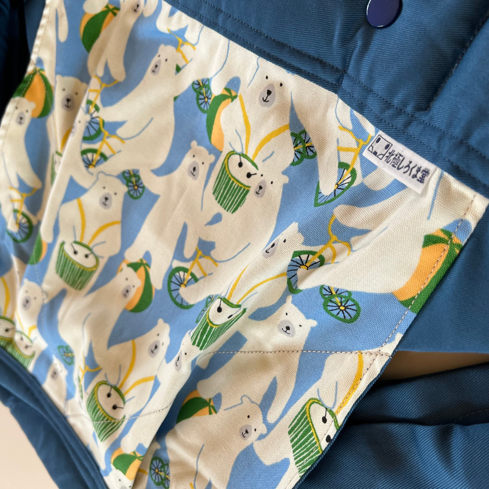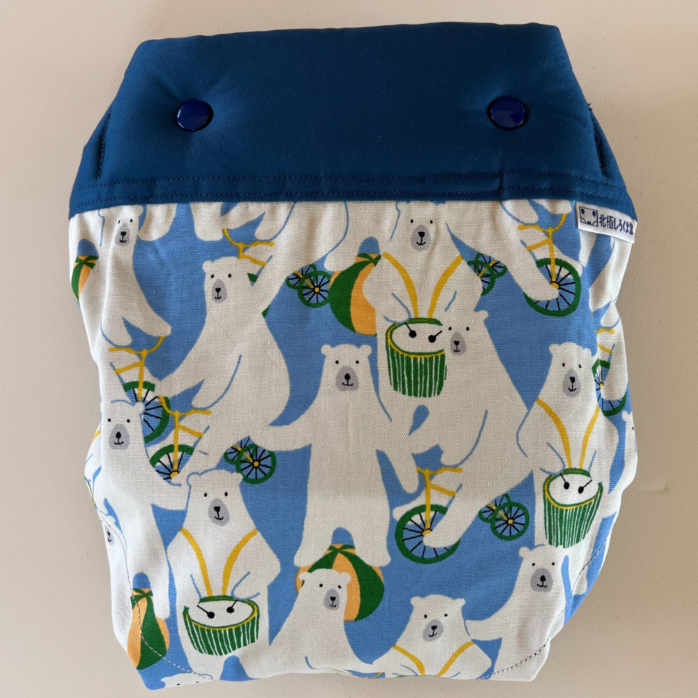さわやかなミネラルブルーの帯、背あてにはかわいいデザインをあしらいました。