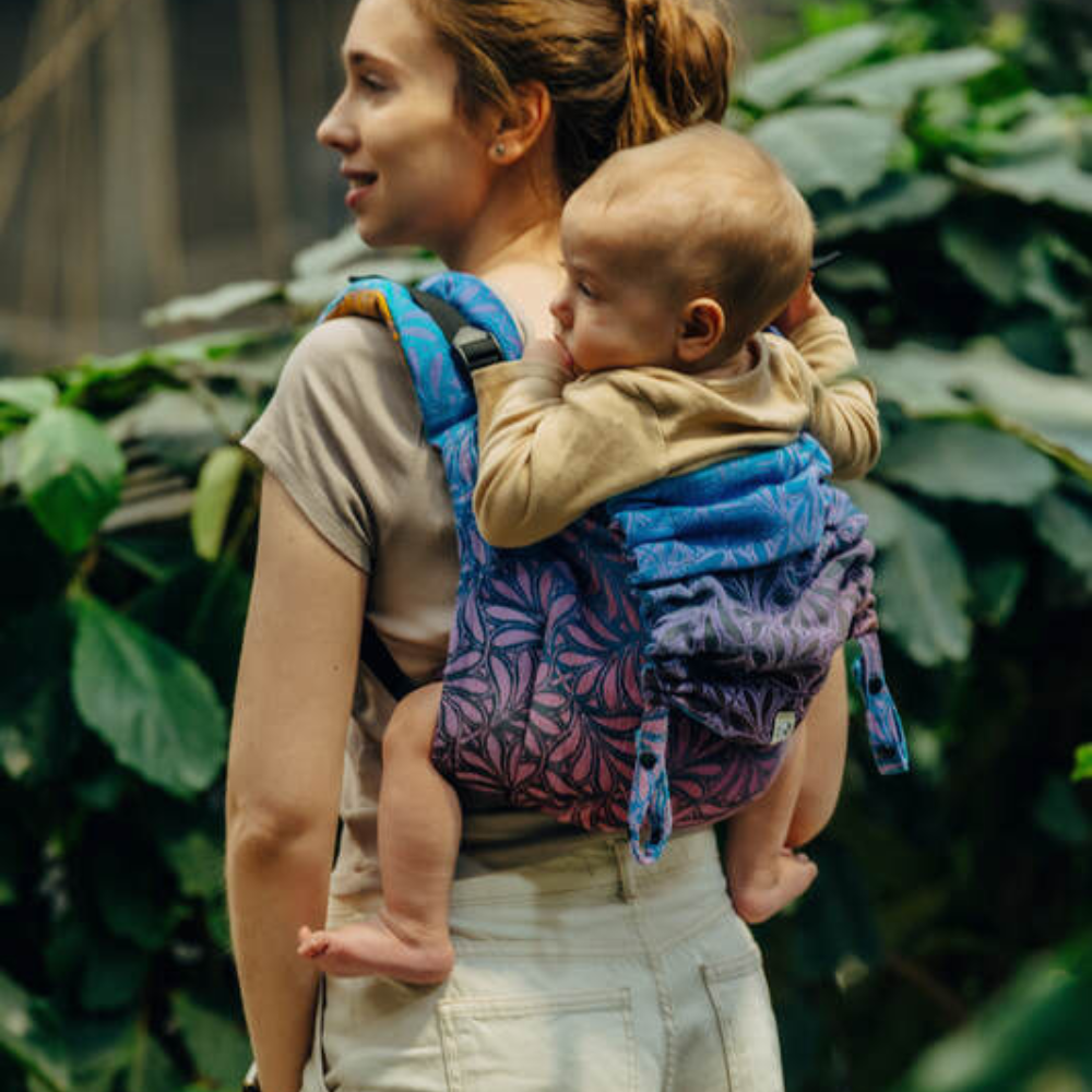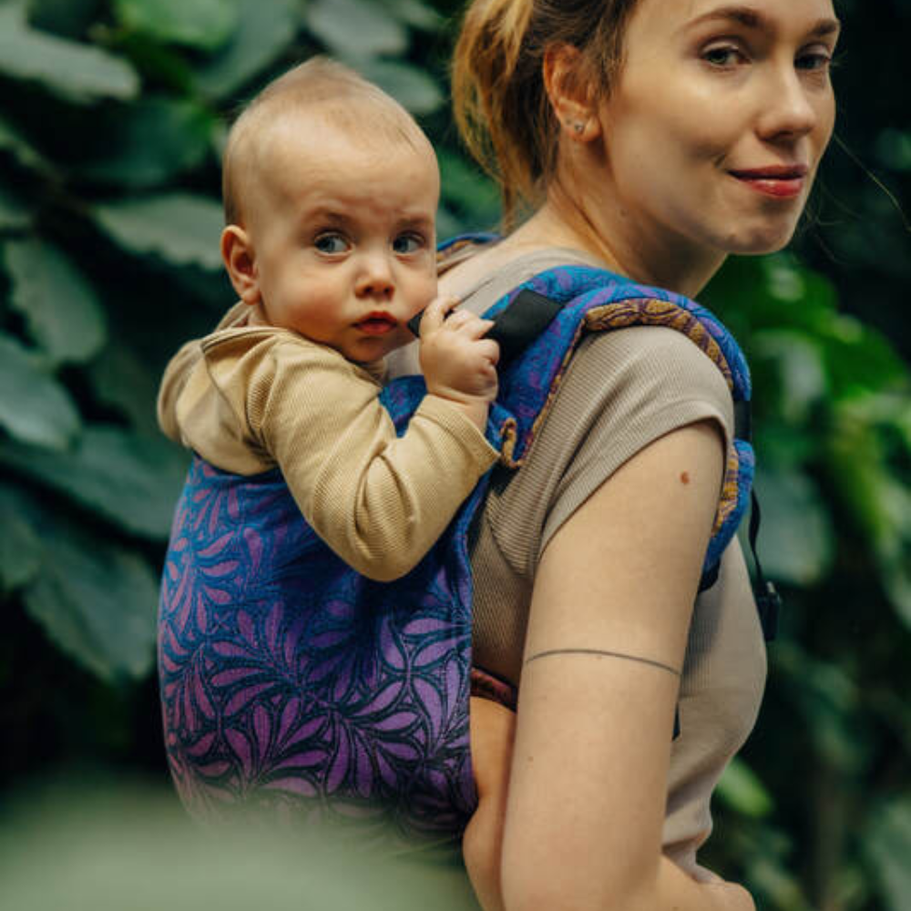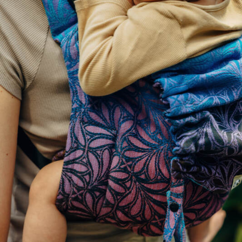 Lenny Lambバックル留め Onbuhimo(おんぶひも)です。おんぶするのも怖くなく、調整も簡単です。この生地はジャカード織で、赤と濃紺や濃紫などの色が織りなした高級感の感じられる布に仕上がっています。