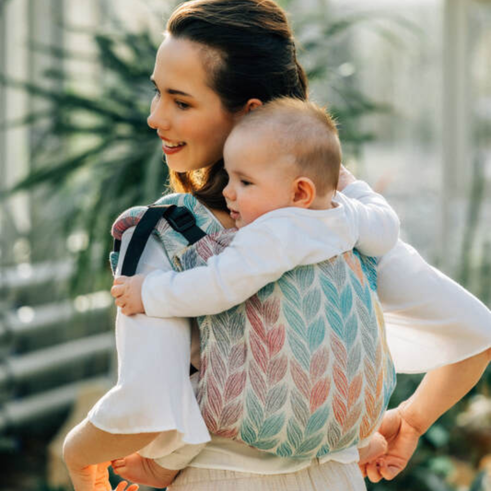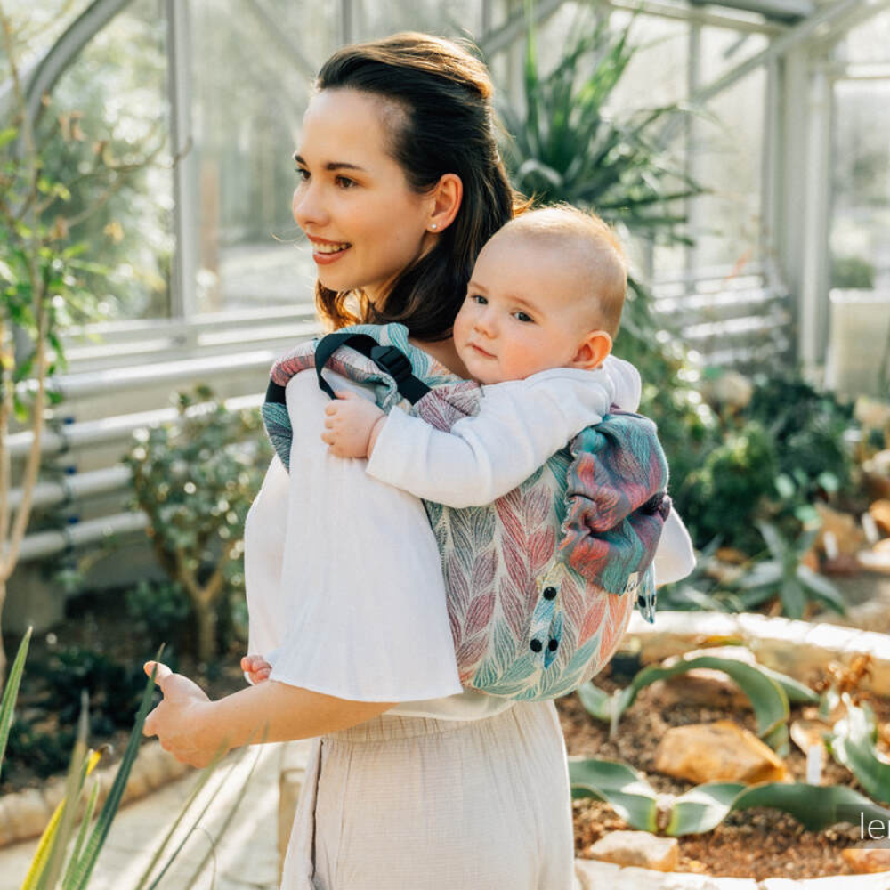 Lenny Lambバックル留め Onbuhimo(おんぶひも)です。おんぶするのも怖くなく、調整も簡単です。この生地はジャカード織でパステルのようなやさしい色合いの生地です。カジュアルな雰囲気でデイリーに活躍しそうです。男性が使ってもいい感じだと思います。