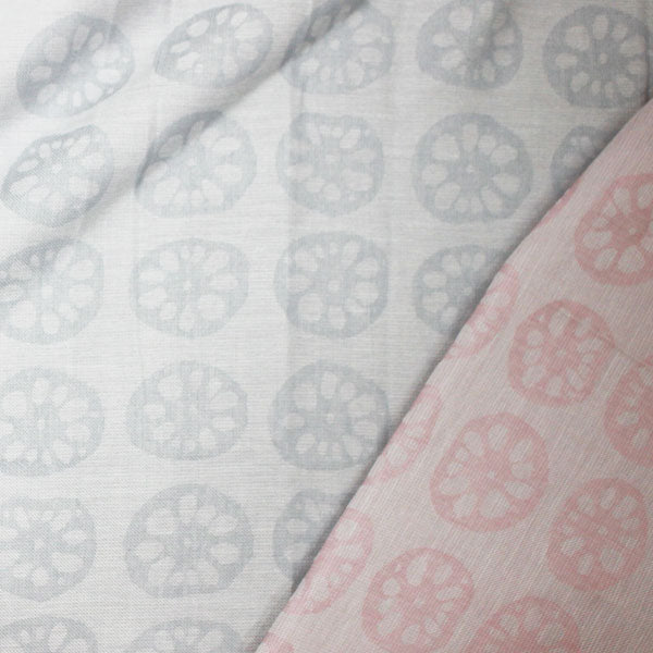 淡いグレーと、上品な色合いの「けし紫(けしむらさき)」とを組み合わせました。どちらも淡くやわらかい色合いです。 柄は輪切りにしたレンコンです。レンコンはお祝いの席でも食される縁起のよい食べ物で、「先を見通す」という意味があります。