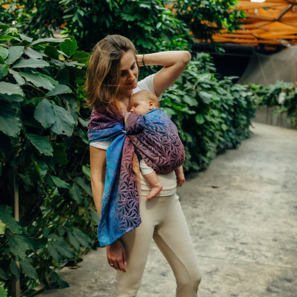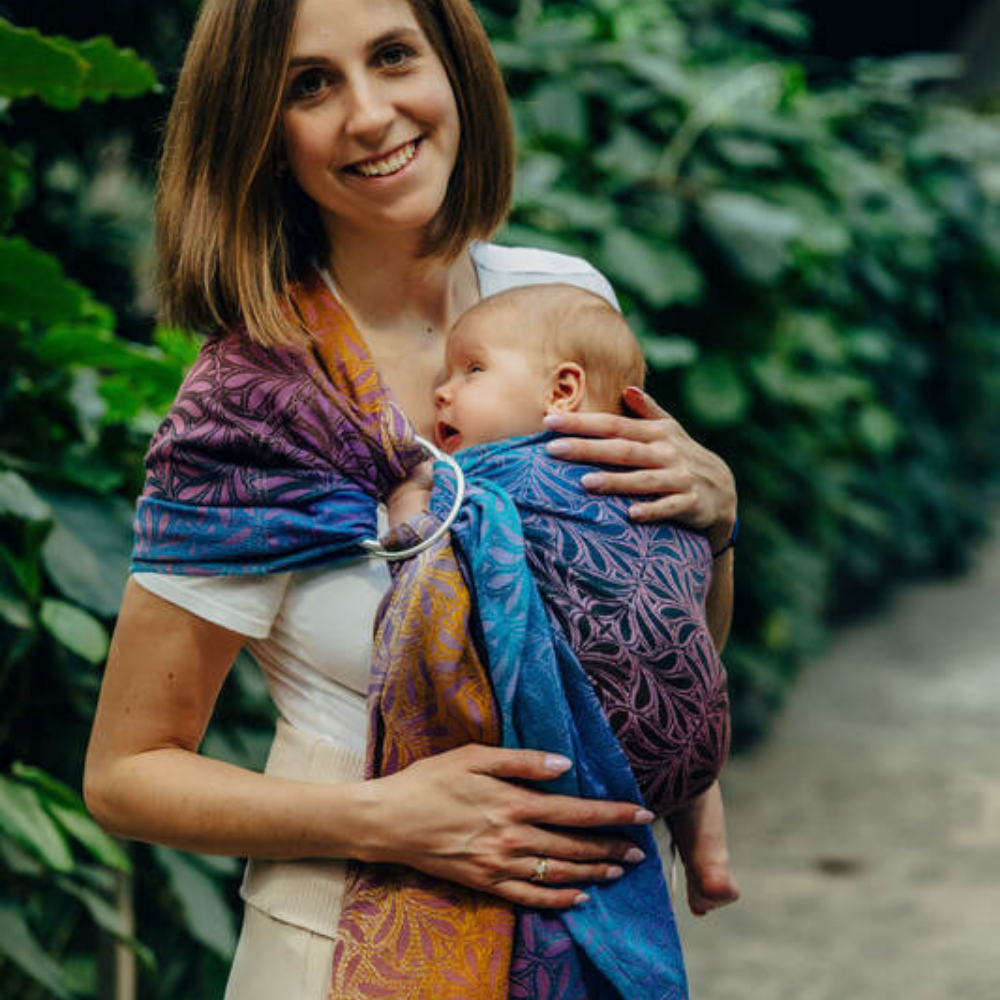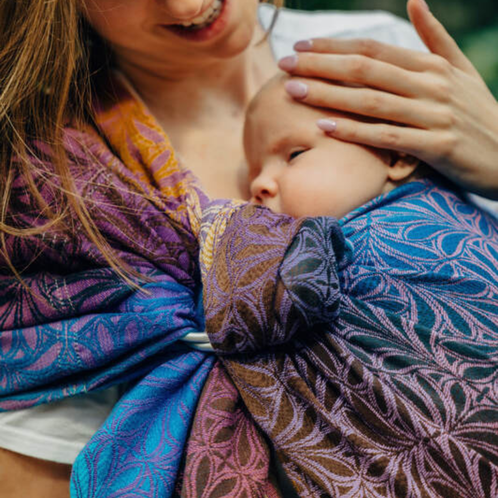 産院でダブルリングのスリングをおすすめされ、購入しました。たまたま配色が好きで選びましたが、色が分かれているから、最初の肩にかける向きやどの布を引っ張るのか等が分かりやすかったので、このデザインを選んでよかったと思っております。また、当初は正直使いこなせなかったのですが、思いきって北極しろくま堂さんに問い合わせをしたら、とても丁寧に教えてくださいました。ラインで写真や動画を送ると的確なアドバイスを下さったので、今では重宝しています。赤ちゃんが爆睡してくれるので、助かってます。